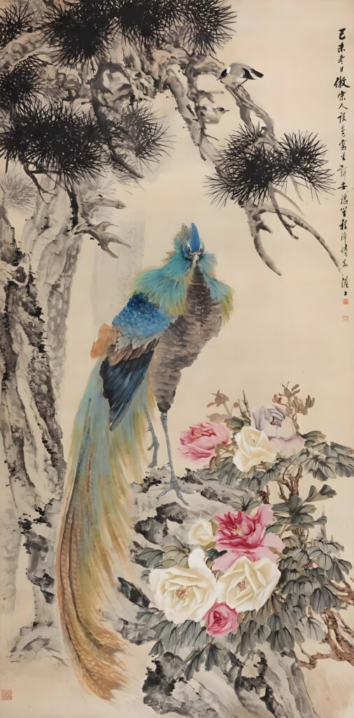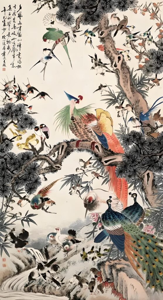 The background of the painting often features lush landscapes or flowering trees, adding to the overall beauty and tranquility of the scene. “One Hundred Birds Paying Homage to the Phoenix” is not just a visual delight but also a cultural treasure, encapsulating themes of loyalty, reverence, and the harmonious coexistence of different beings under a wise and benevolent ruler.