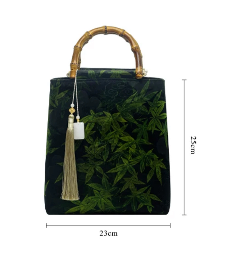 Made with high-quality Gambiered Guangdong Gauze fabric featuring bamboo leaf patterns, and handcrafted with bamboo handles.