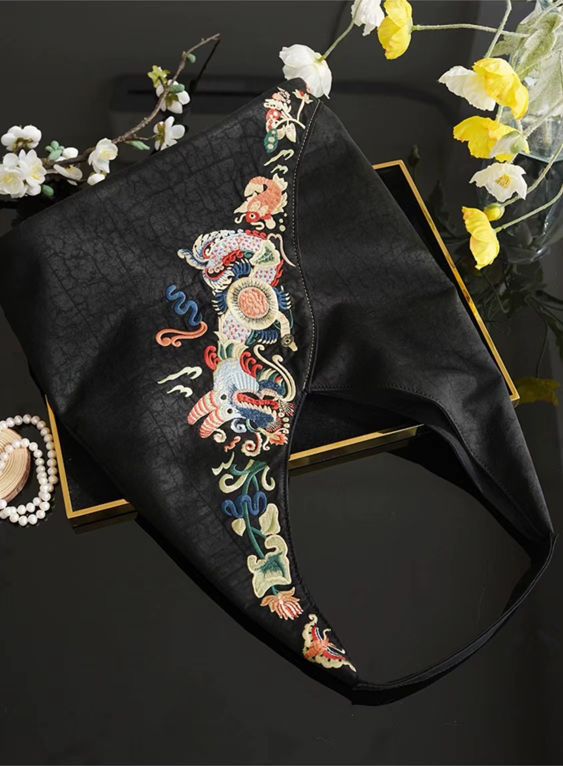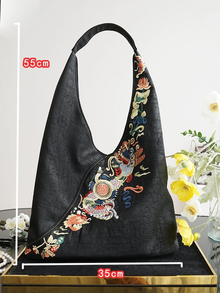 The bag, embroidered with a pattern combining the dragon and koi carp, symbolizes the phrase “The carp leaps over the dragon gate,” representing great success, a turning point in life, and the spirit of overcoming challenges and forging ahead. It also incorporates the Song Dynasty collar design style, blending beauty and practicality with a classical, elegant aesthetic.
