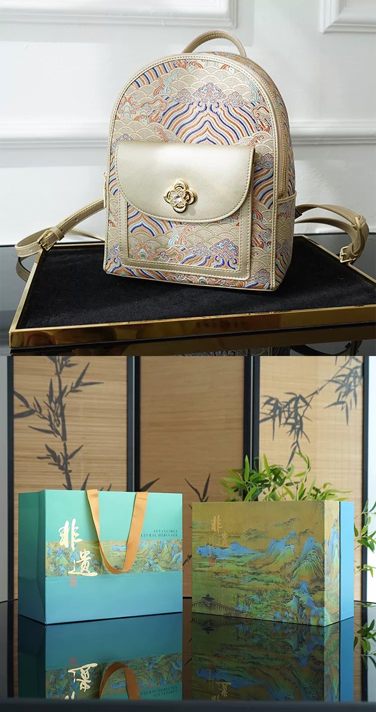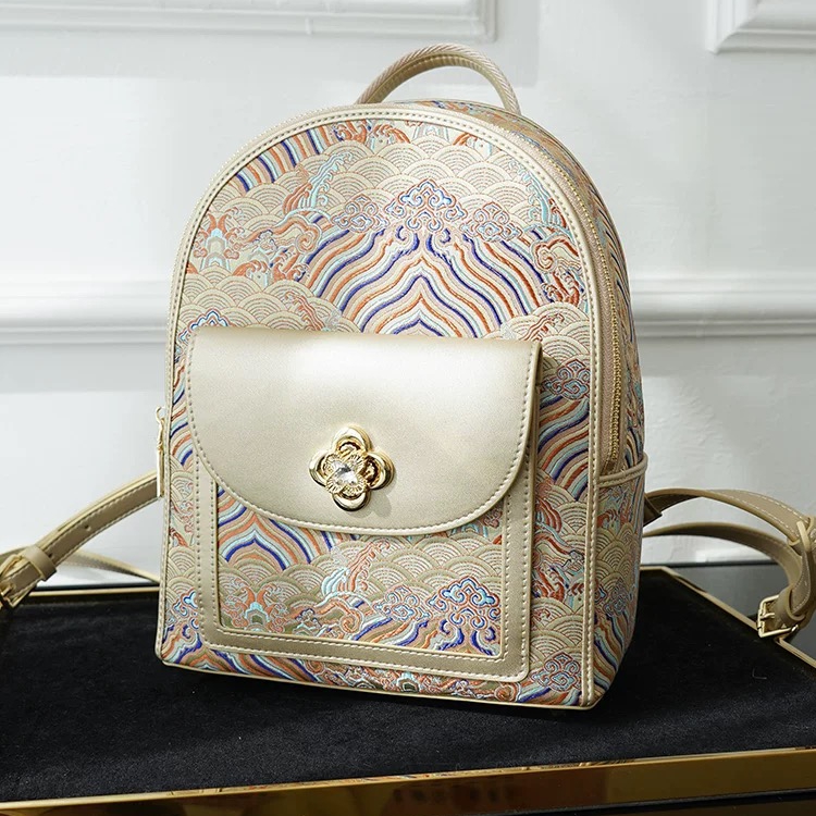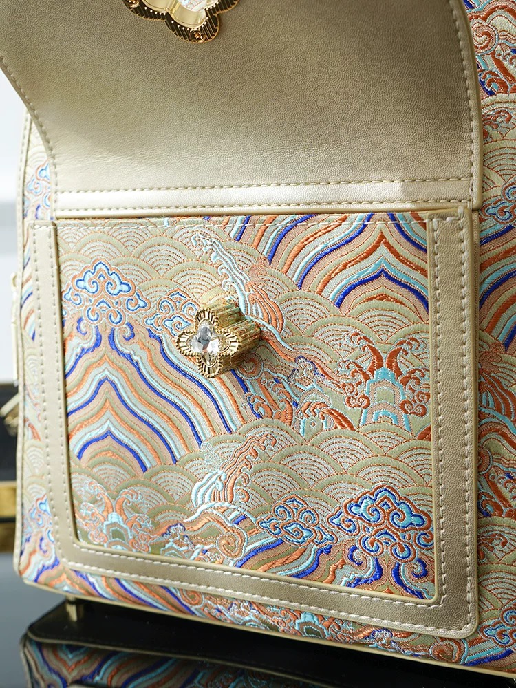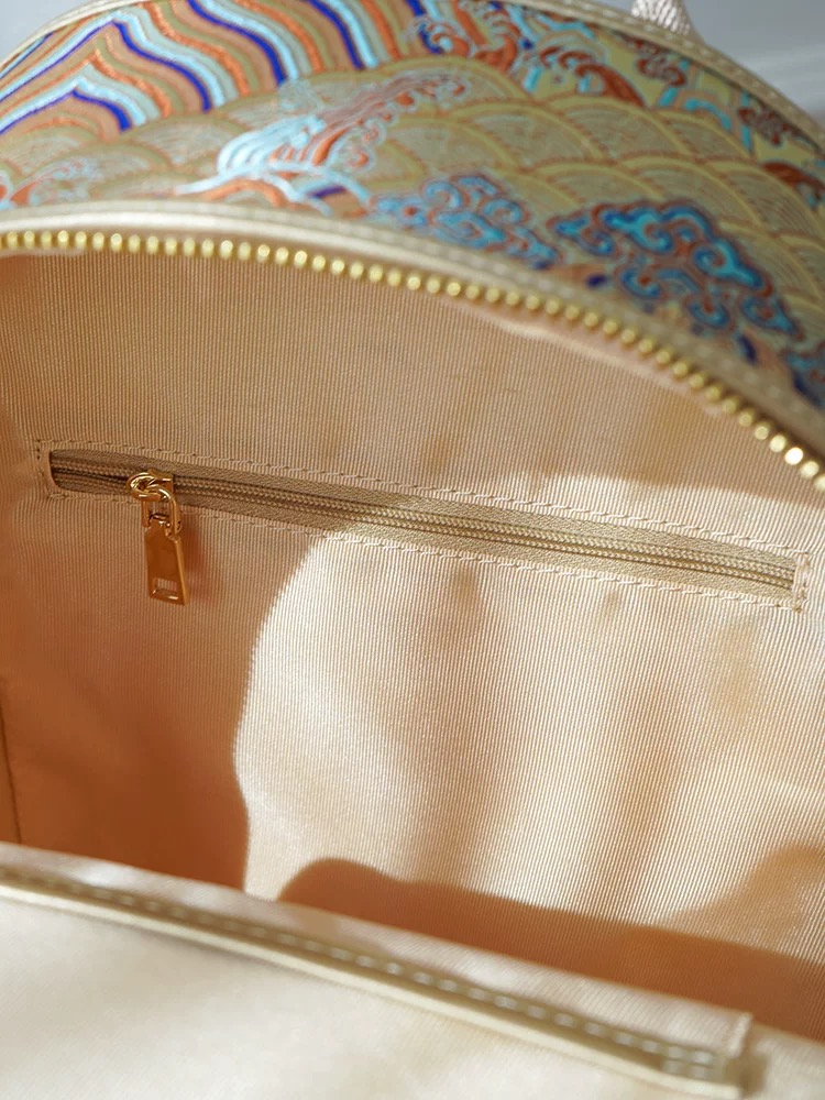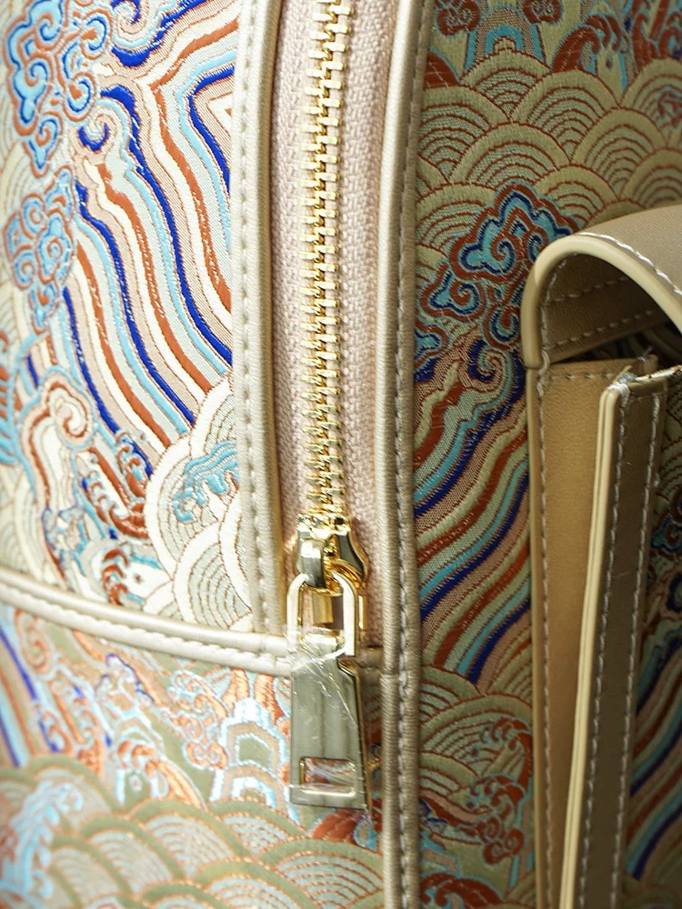 The backpack showcases the “Seawater and Cliff” motif, a traditional Chinese auspicious pattern symbolizing prosperity, stability, and everlasting peace. This intricate design conveys blessings for enduring success and unwavering fortune.