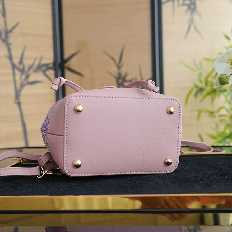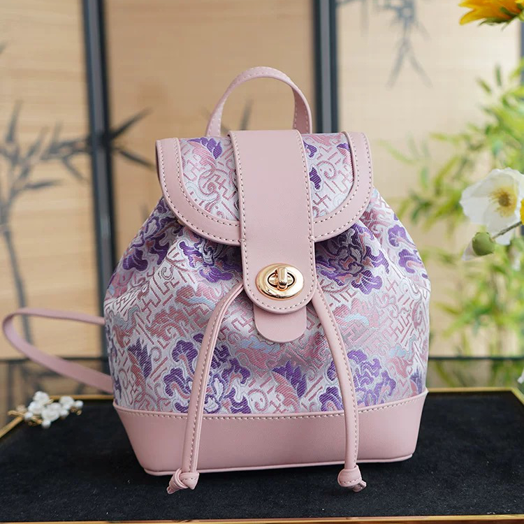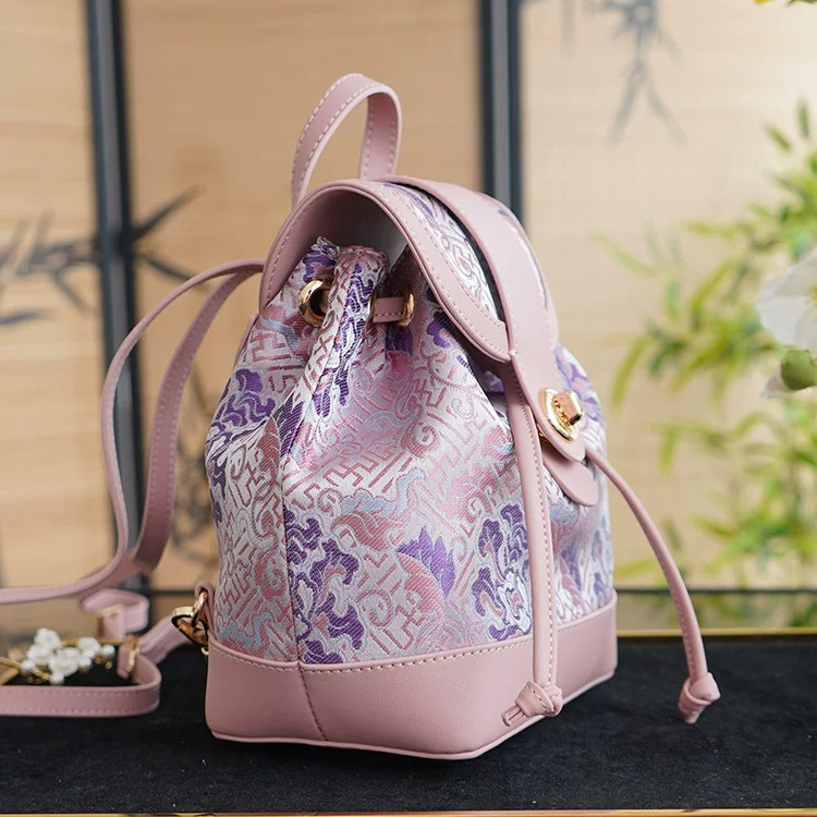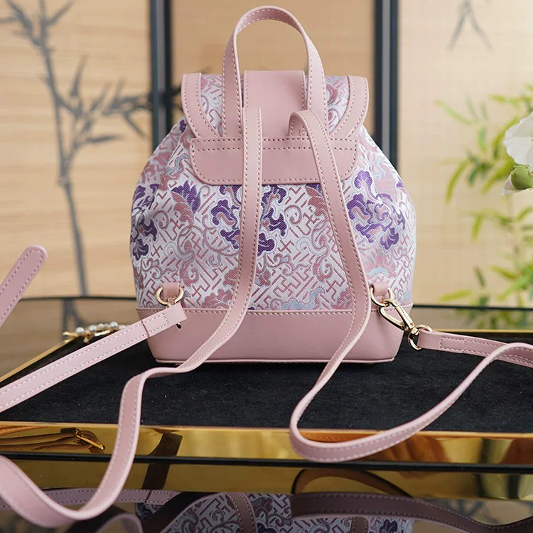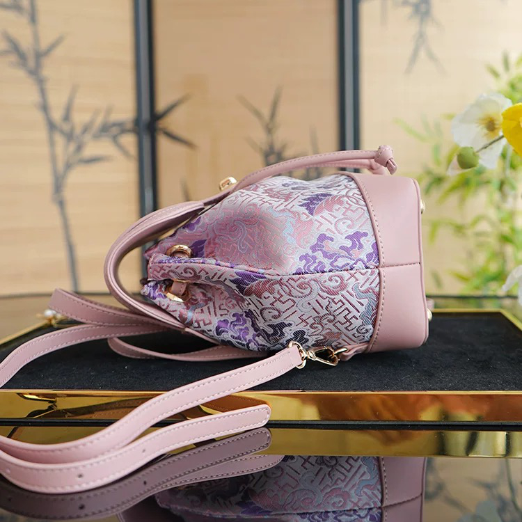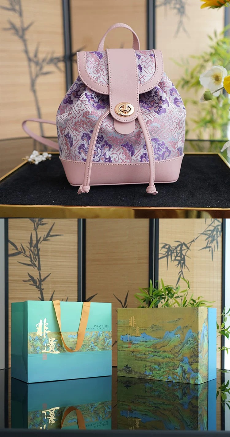 The handbag is crafted from 100% silk Song brocade (宋锦), a prestigious textile with over a thousand years of history, once exclusively reserved for royalty and nobility. This exquisite fabric is known for its intricate weaving techniques and rich, elegant patterns. Complementing the luxurious brocade, the bag features high-quality microfiber leather straps, ensuring both durability and comfort.